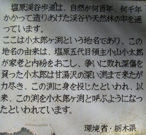 ここは小太郎ヶ渕という地名であり、この地名の由来は、塩原五代目領主小山小太郎が家老と内紛をおこし、争いに敗れ深傷を負った小太郎は甘湯沢の深い渕まで来たが力尽き、この渕に身を投じたといわれ、以来、この渕を小太郎ヶ渕と呼ぶようになったといわれています。 環境省・栃木県」