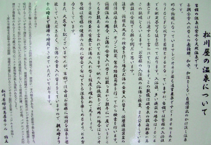 現在は、那須湯本浴場組合が管理運営し、地区の住民及び湯治客の皆様にも喜ばれております。 那須町商工会湯本支部」(※「行人の湯」とあるのは正しくは「御所の湯」です。)