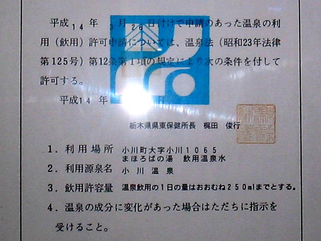 湧出地:旧小川町大字小川字下河原地先 泉温:26.2℃(気温32.0℃) 湧出量:13.4L(掘削自噴)