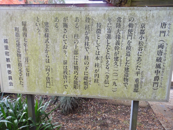 京都小松谷にあった平重盛邸の勅使門を模造した建造物で、常陸大掾義幹が建久二(一一九一)年に寄進したと伝える。(寺伝)