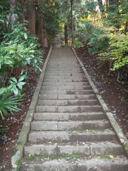 平重盛の墓は、立ち入り禁止の柵が設けられた、苔がむし経年で角がとれ丸みを帯びた石段の上にあります。