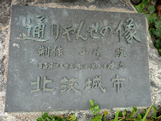 「この像は、昭和三十五年五月五日国道舗装の完成を祝って建てられた。二ツ島という風光明媚の地に、往き交う人々の旅情をなぐさめてくれればと念じつつ建立され、当時、野口雨情詩「あの町この町」からヒントを得てつくられたこの二人の童が、通りゃんせのポーズをしているところから、いつとはなしに「通りゃんせ」の像として親しまれるようになった。題名も作者名も不明のまま路傍の彫刻として放置されていたが、道往く人々の幸せと交通の安全祈願し、昭和四十五年・建立十周年を記念して、「通りゃんせの像・山崎猛作」と命名された。