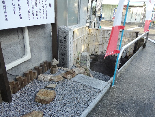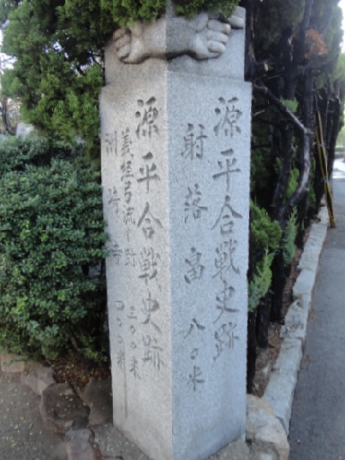 昭和六年継信の墓所大修築と共にこの地に柵をめぐらし池泉をつくり射落畠碑と、遠祖君乗馬薄墨碑を建立し、これをあらわしました。