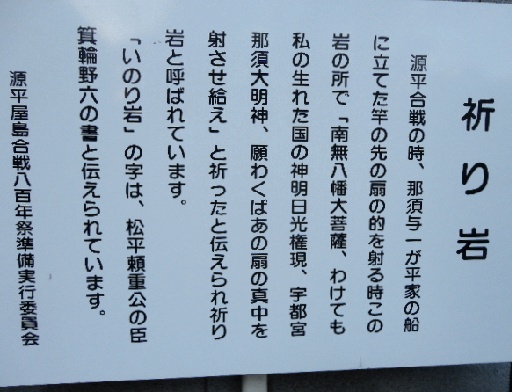 源平合戦の時、那須与一が平家の船に立てた竿の先の扇の的を射る時この岩の所で「南無八幡大菩薩、わけても私の生まれた国の神明日光権現、宇都宮那須大明神、願わくばあの扇の真中を射させ給え」と祈ったと伝えられ祈り岩と呼ばれています。
