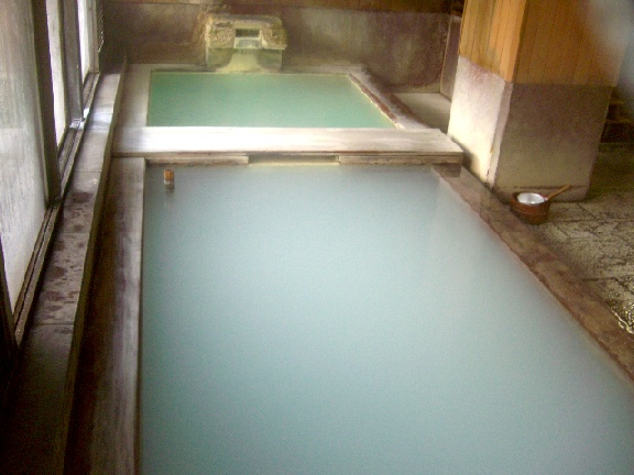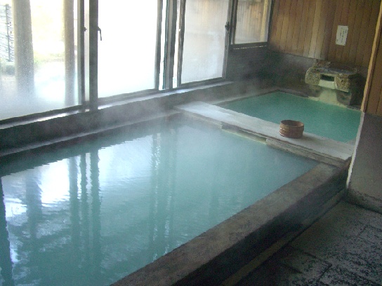 内湯の両浴槽の色と透明度のコントラストが美しいです。湯口側の浴槽は激熱です。
