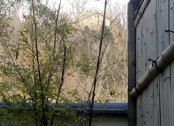 露天風呂からはちょうど真正面の丘の上に「憩いの家」(残念ながら閉館)が見えます。