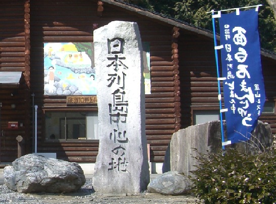 蓬山ログビレッジの前に「日本列島中心の地」碑が建っています。