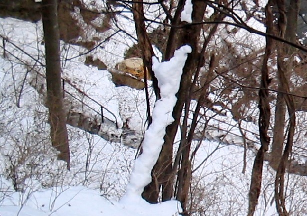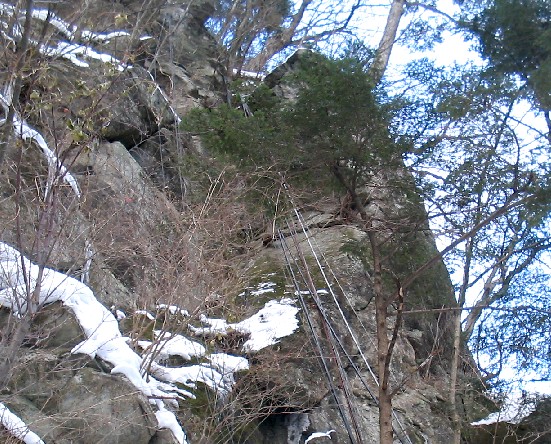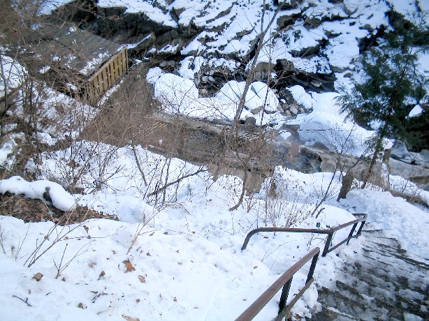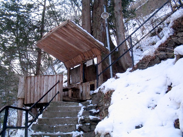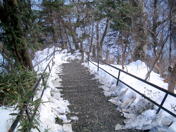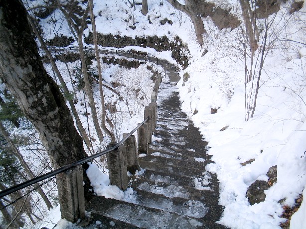石段は雪かきされているものの、手すりがついていないと滑って滑落しそうです。