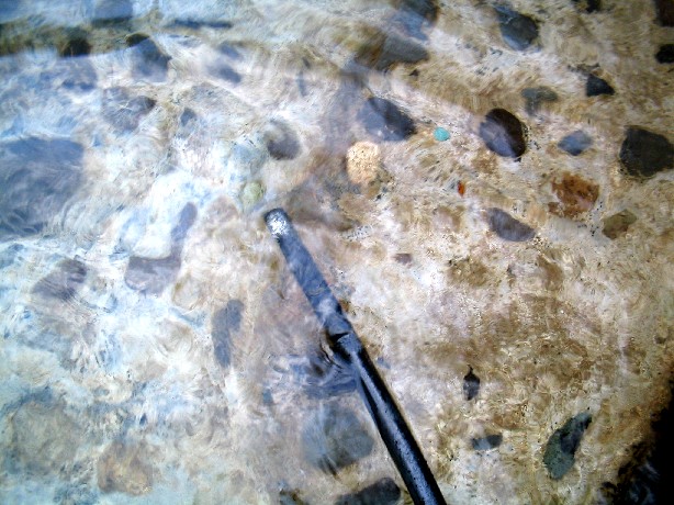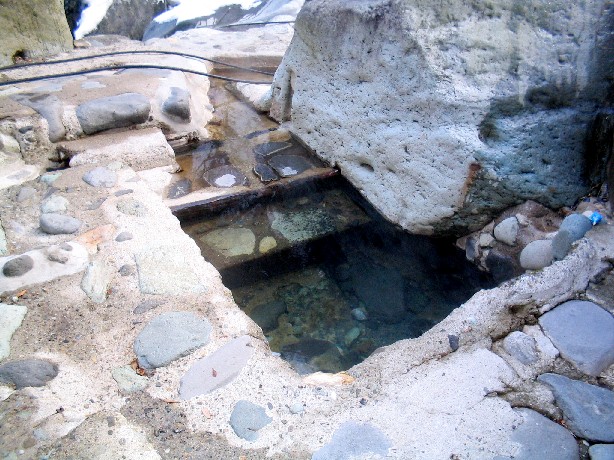 一番小さな方形の露天風呂です。湯底は大小の石と砂地となっており、源泉は足元から湧出しています。