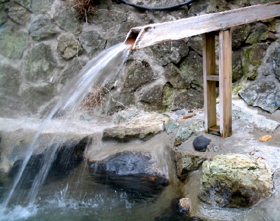 四角形の木の板の導管から熱めの源泉がとうとうと落とされています。