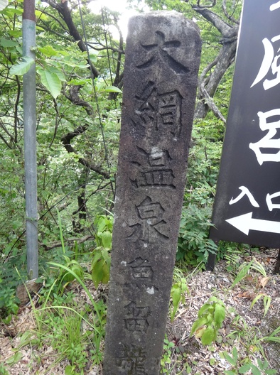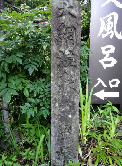 野天風呂への入口階段に、石標「大網温泉 魚留瀧」があります。