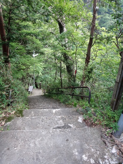 国道400号新バイパス開通に伴い、旧道となった道路のカーブミラーから石段を下りていきます。