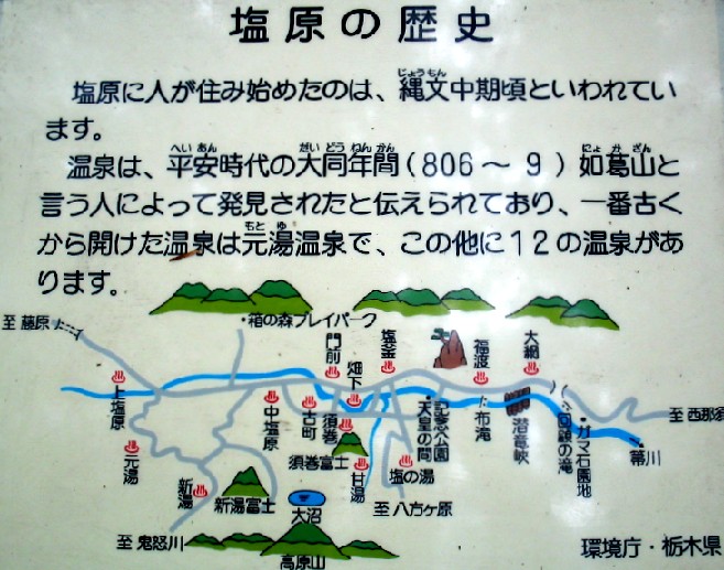 温泉は、平安時代の大同年間(806〜809)如葛山(にょかざん)と言う人によって発見されたと伝えられており、一番古くから開けた温泉は元湯温泉で、この他に12の温泉があります。 環境庁・栃木県」